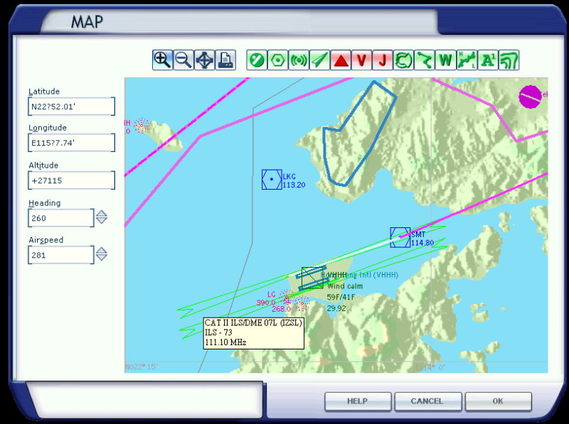 接近機場時進場台要求在Runway 7L降落,打開Map移到7L上方看看ILS頻率是111.10。 |